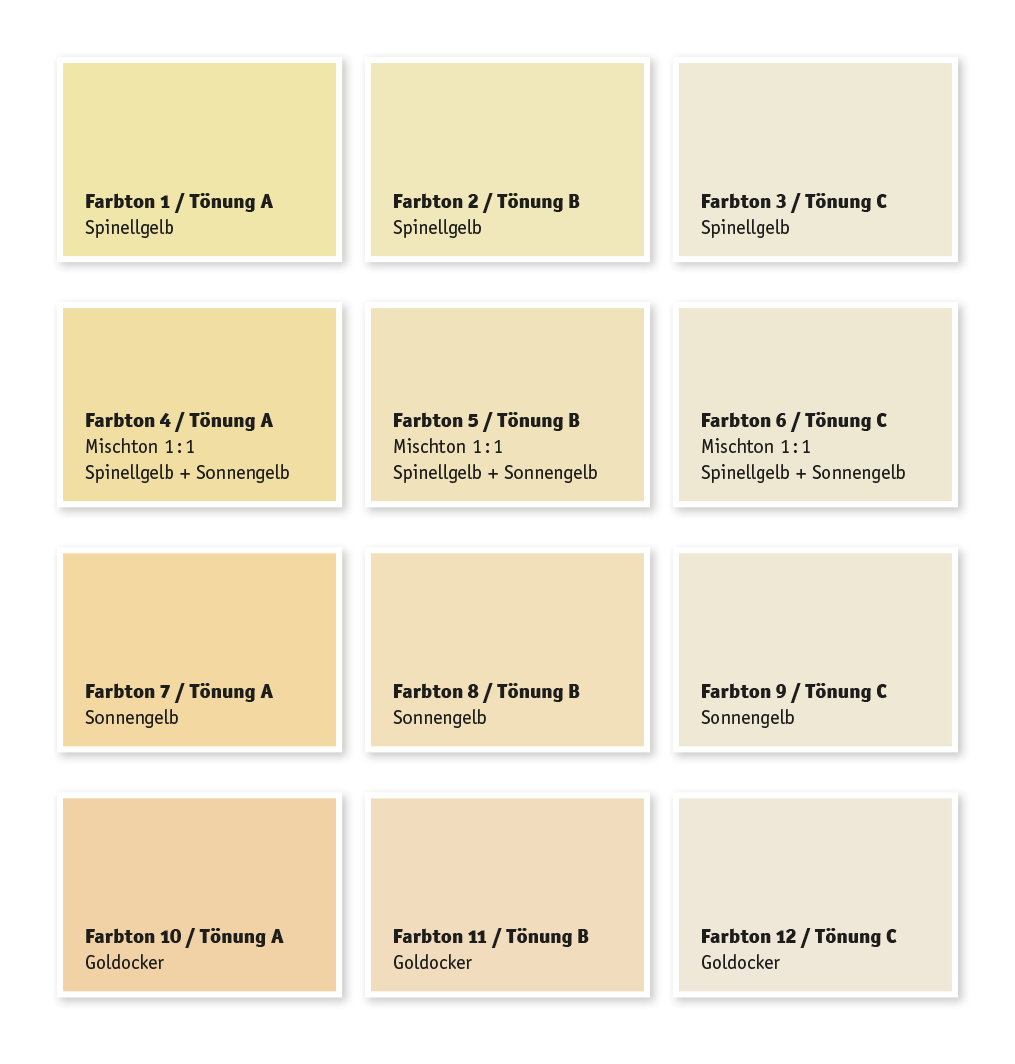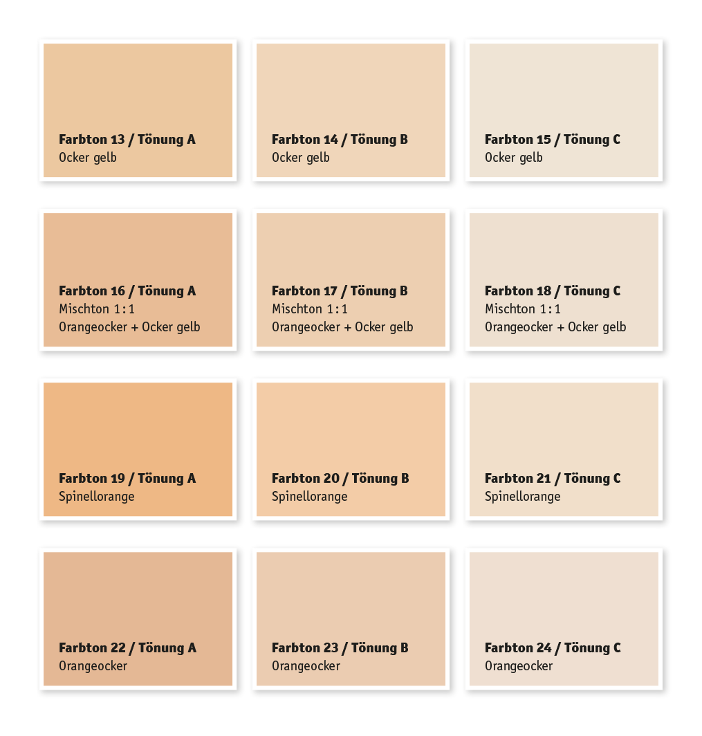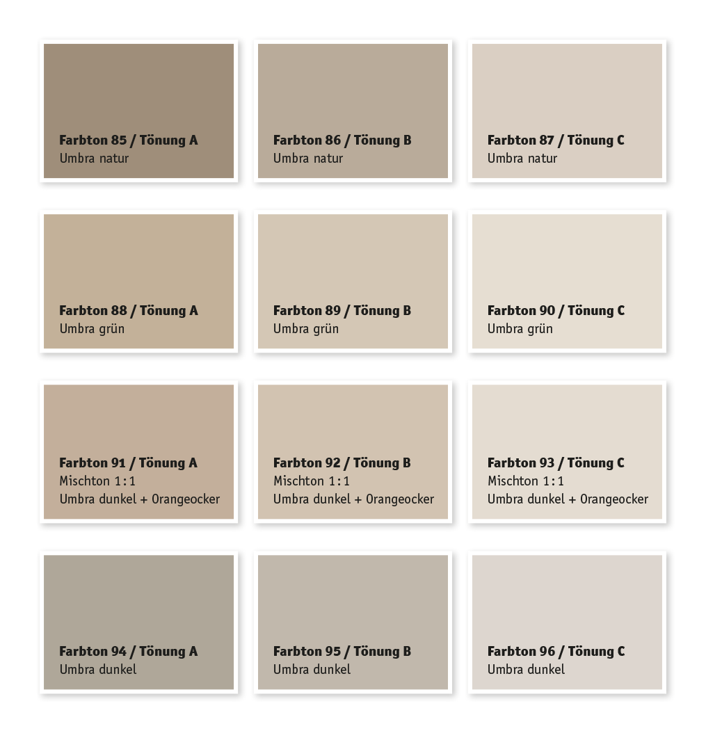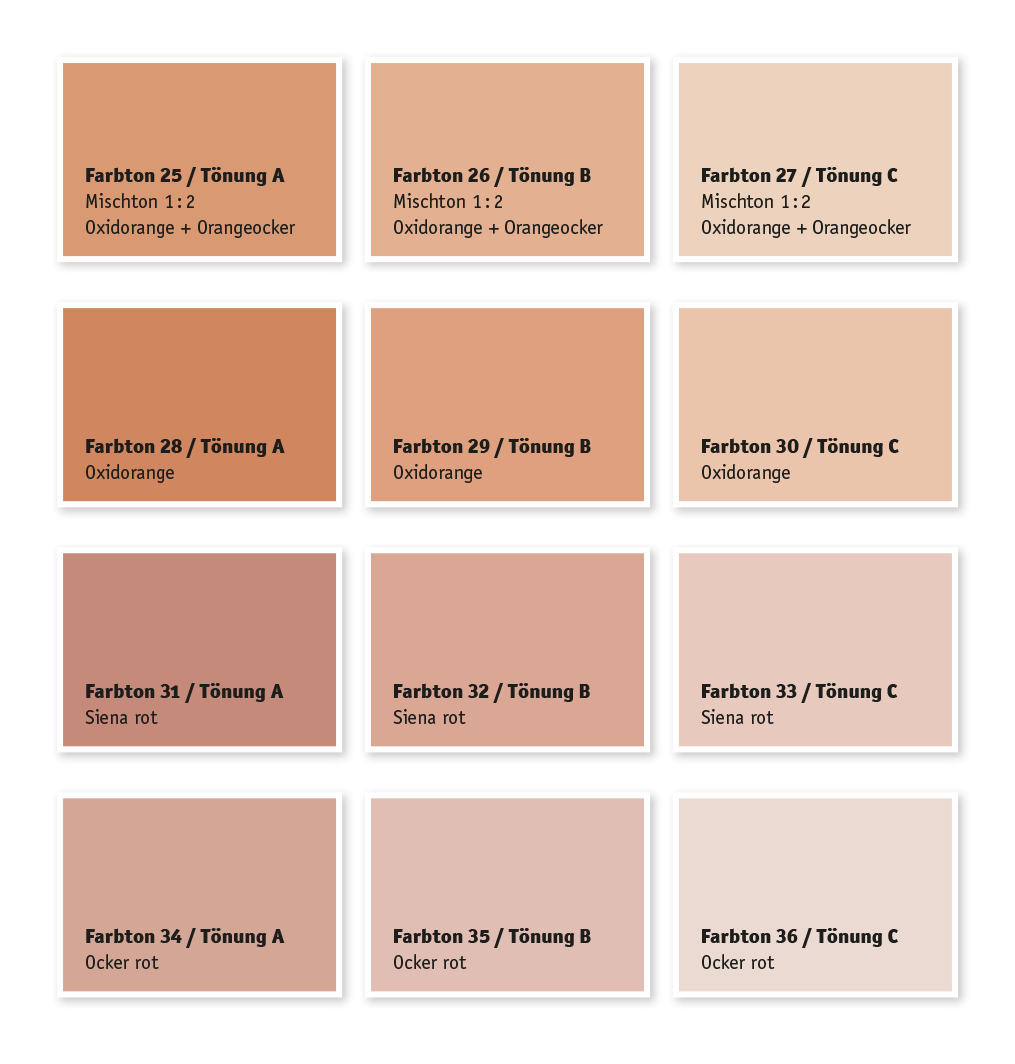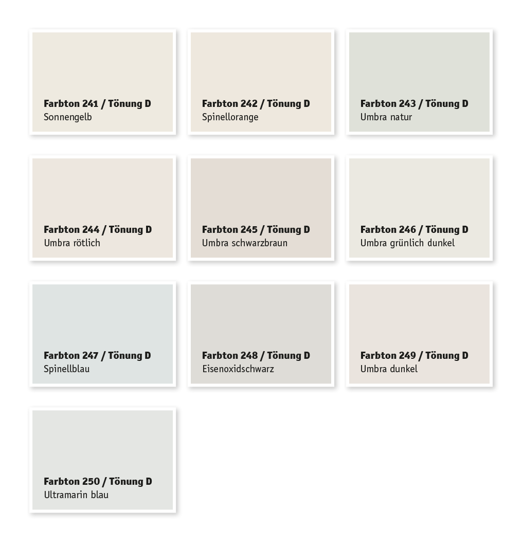 Die Online-Farbkarten dienen ausschließlich der groben Orientierung. Wir möchten darauf hinweisen, dass die Farbtöne durch verschiedene Monitore und deren Einstellungen nicht immer korrekt dargestellt werden können. Gleiches gilt auch für selbst erstellte Ausdrucke dieser Farbkarten. Um einen besseren, bzw. originalgetreuen Eindruck von unseren Farben zu bekommen, empfehlen wir den Erwerb unseres Farbfächers, unserer Farbkarten mit Original-Aufstrichen oder unsere gedruckten, kostenlosen Flyer.
