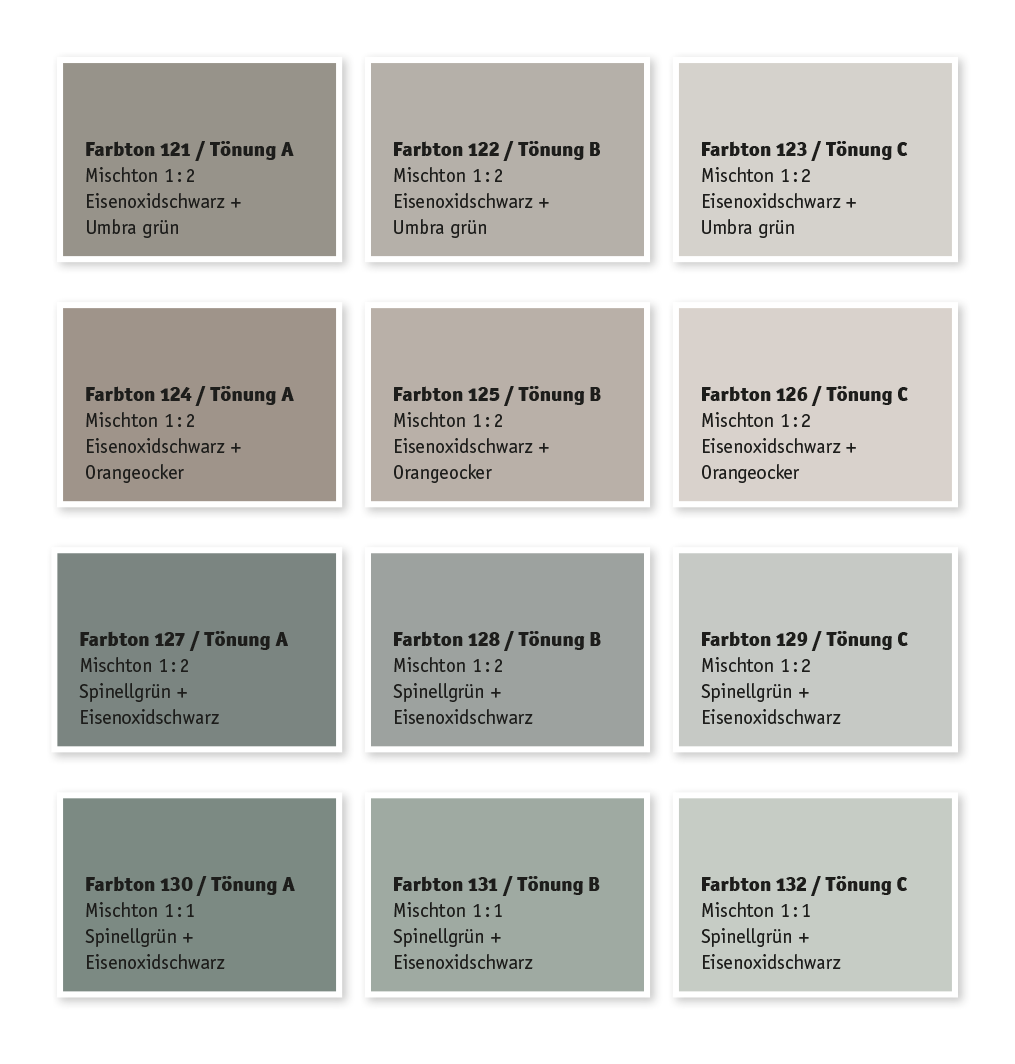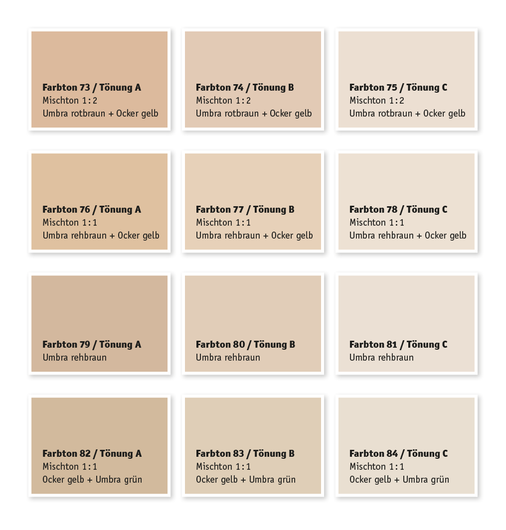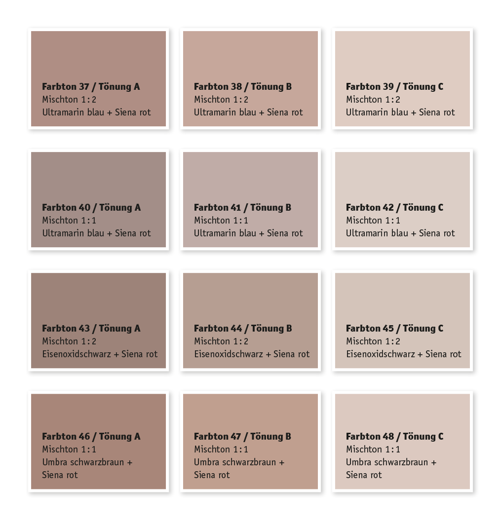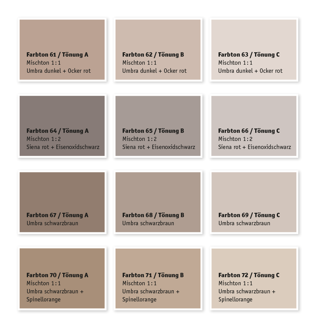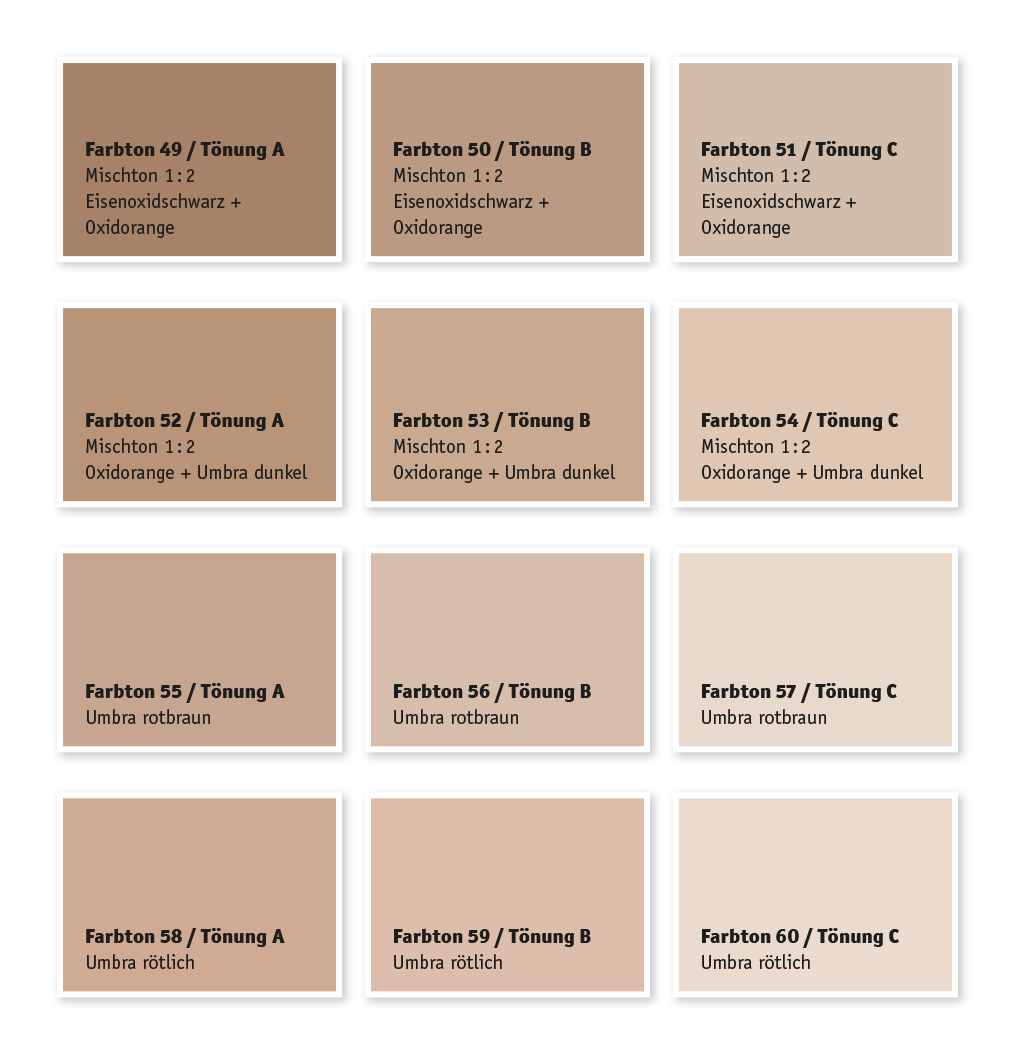 Farbfächer mit 250 Farbtönen, einfach zu mischen mit jeweils einem bis zwei Erd- und Mineralpigmenten.