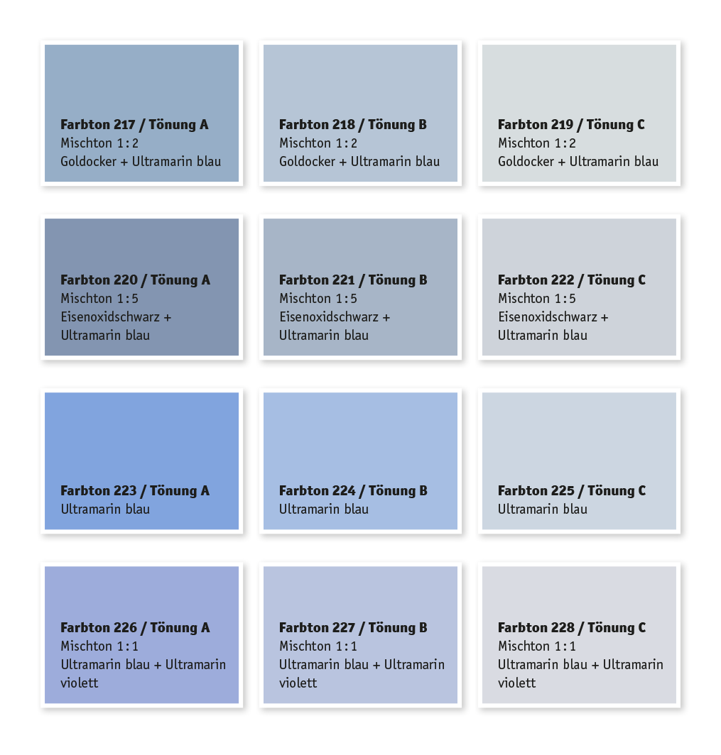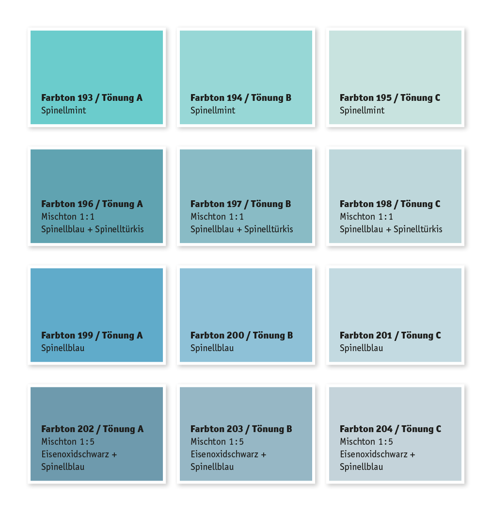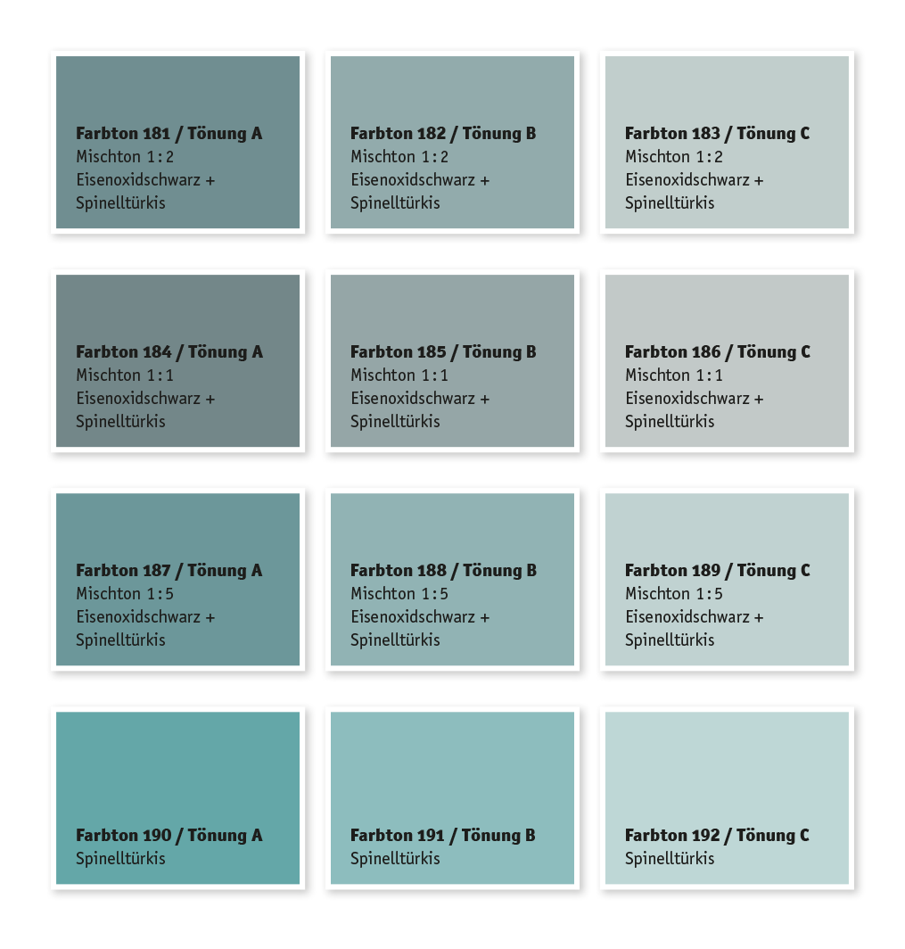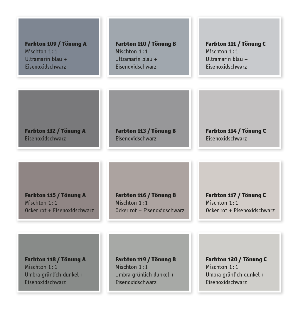 Farbfächer mit 250 Farbtönen, einfach zu mischen mit jeweils einem bis zwei Erd- und Mineralpigmenten.