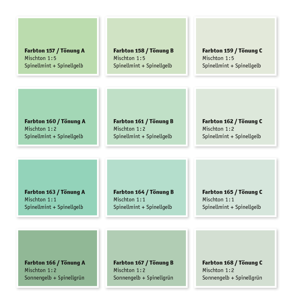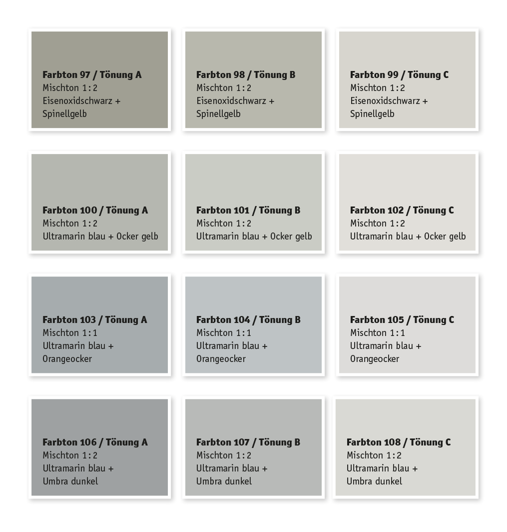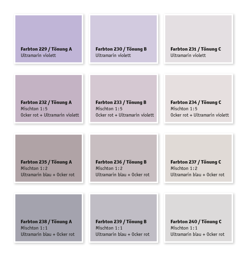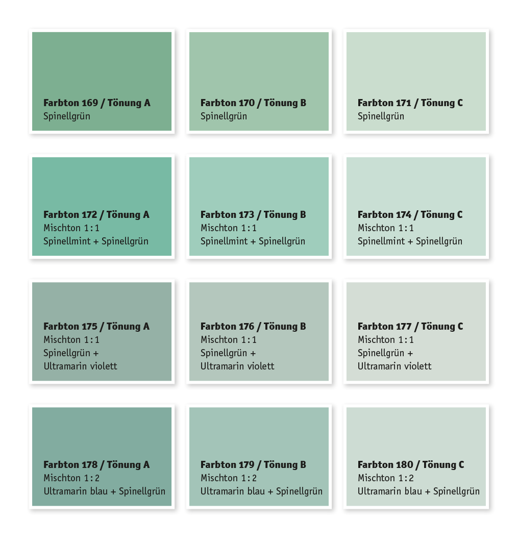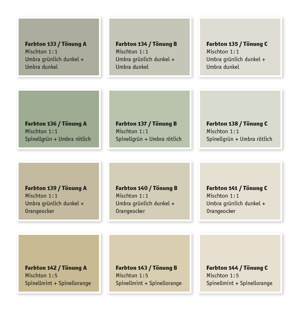 Farbfächer mit 250 Farbtönen, einfach zu mischen mit jeweils einem bis zwei Erd- und Mineralpigmenten.