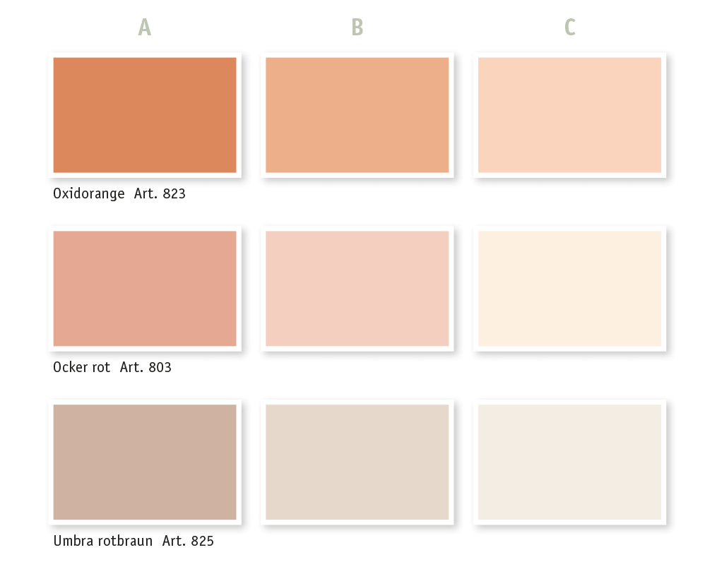 Wir möchten darauf hinweisen, dass die Farbtöne durch verschiedene Monitore und deren Einstellungen nicht immer korrekt dargestellt werden können. Gleiches gilt auch für selbst erstellte Ausdrucke dieser Farbtöne. Um einen besseren, bzw. originalgetreuen Eindruck von unseren Farben zu bekommen, empfehlen wir den Erwerb unseres Farbfächers, unserer Farbkarten mit original-Aufstrichen oder unsere gedruckten, kostenlosen Flyer.